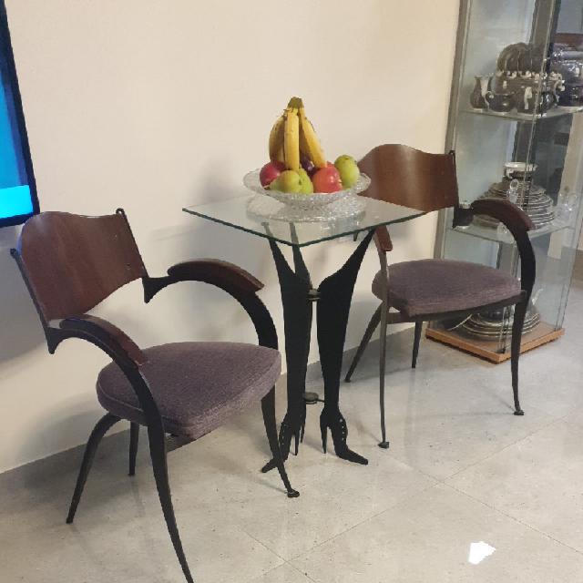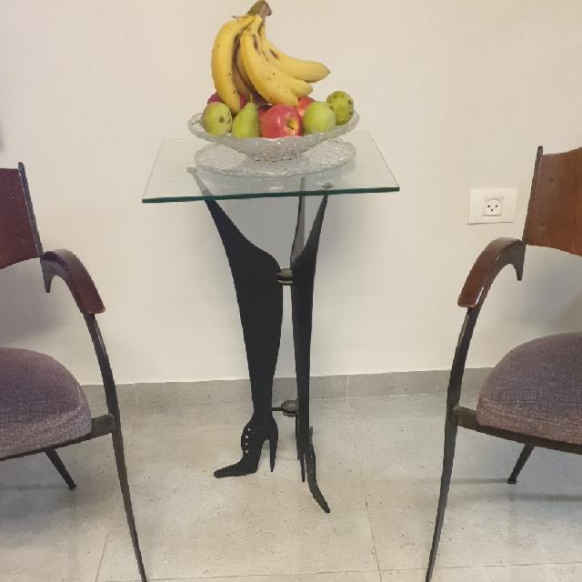 2 כורסאת, מעמד בצורת רגלי אישה. קערת קריסטל עם מגש קריסטל. קומפלקט