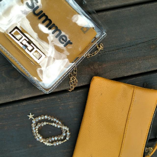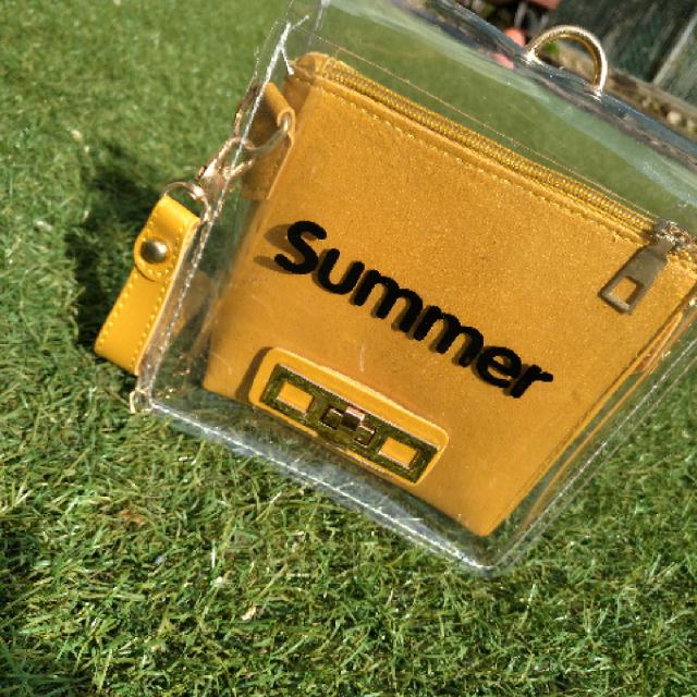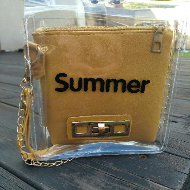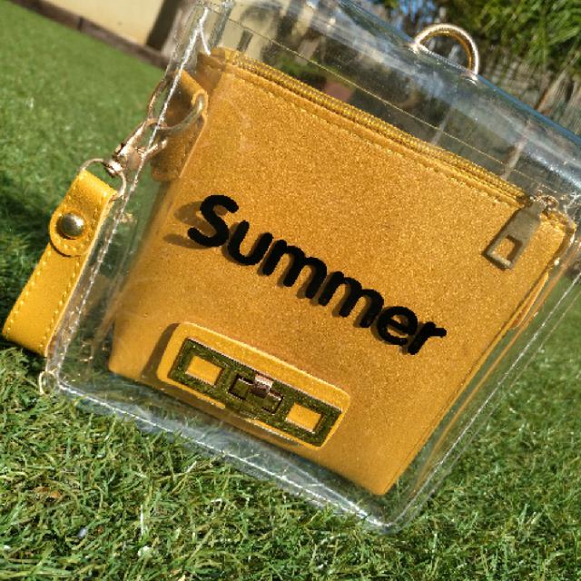 תיק שקוף עם נרתיק קטן בצבע חרדל תיק סופר אופנתי ופרקטי...