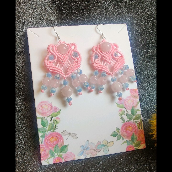 עגילי מקרמה עם קוורץ וחרוזי זכוכית