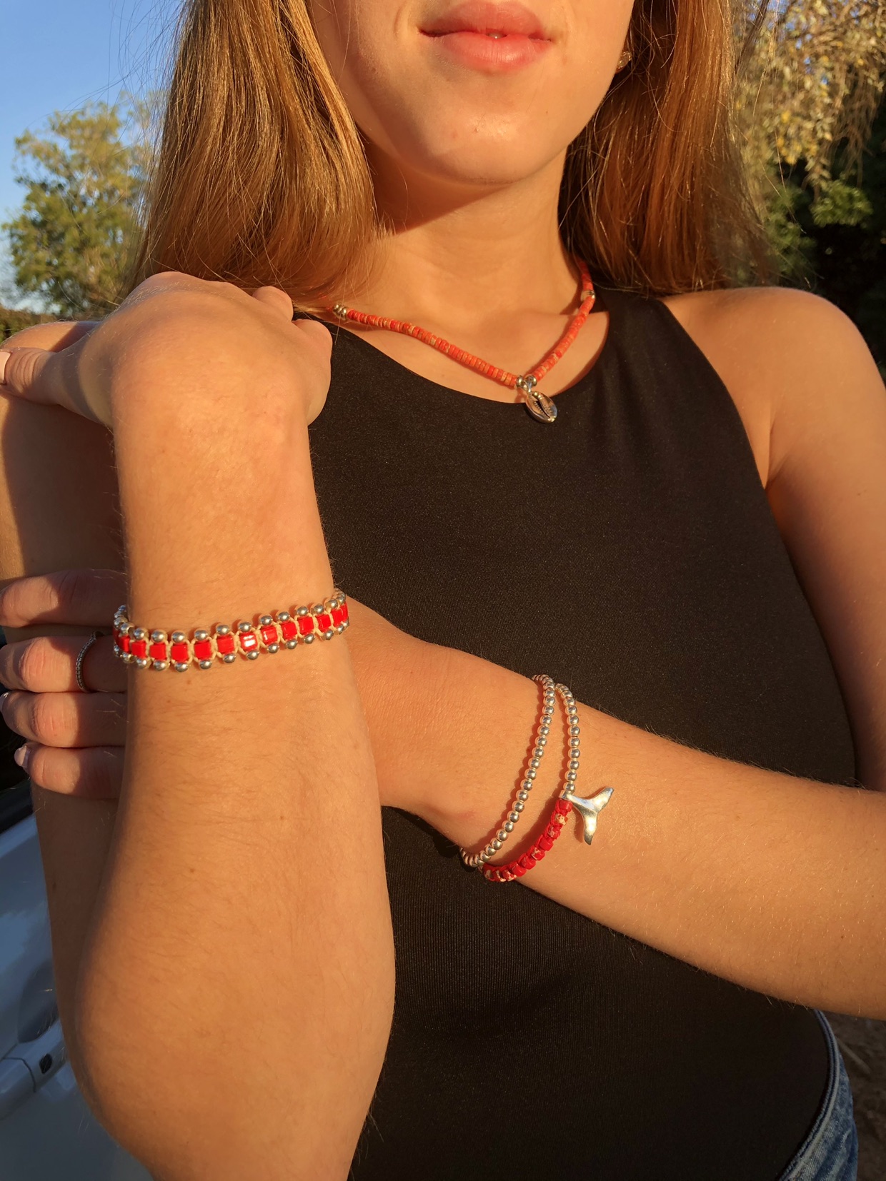 צמיד כסף אמיתי עם חרוזים אדומים בשילוב סנפיר