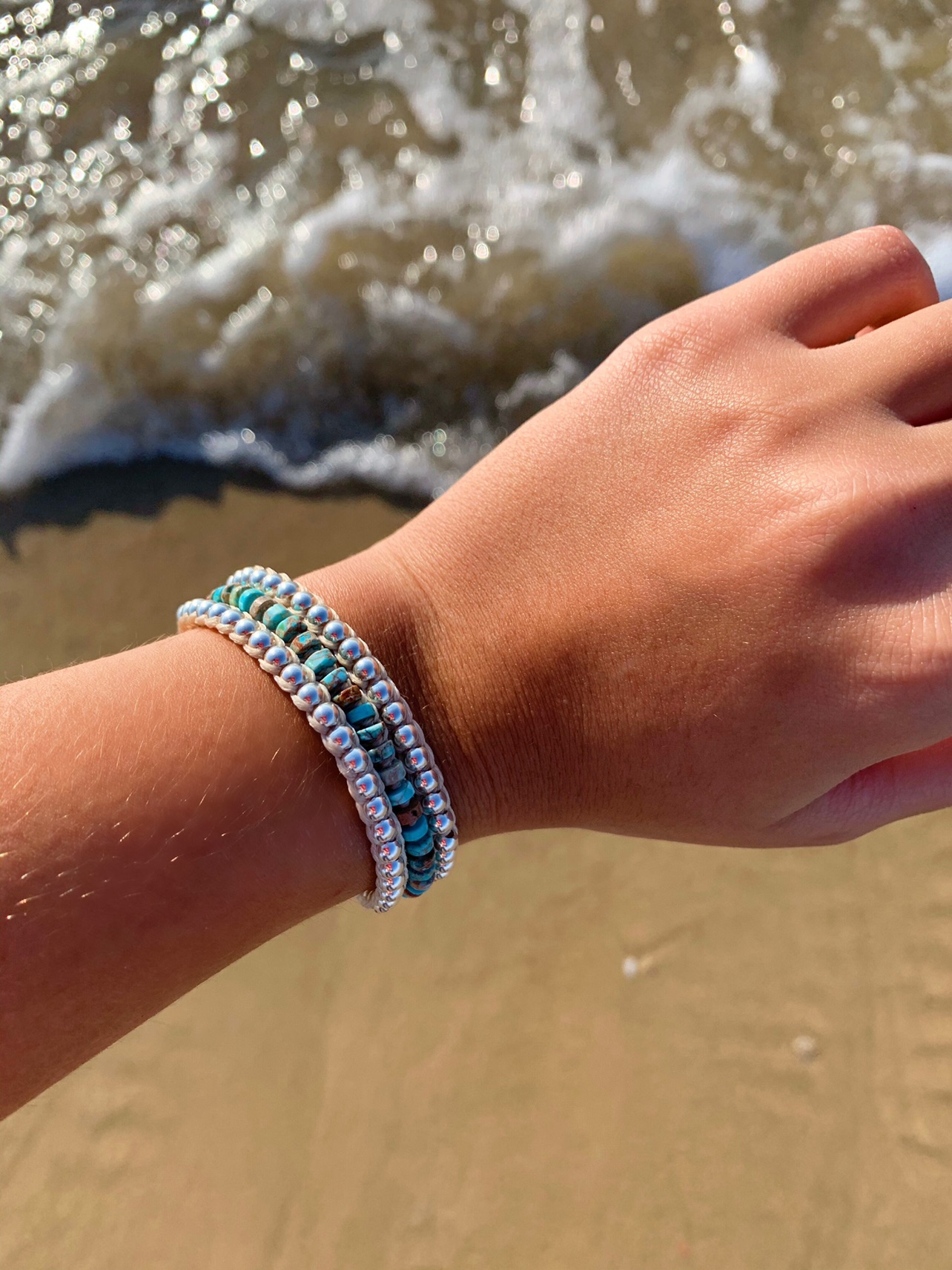 צמיד שלושה סיבובים של חרוזי כסף אמיתי 925 וחרוזי טורקיז