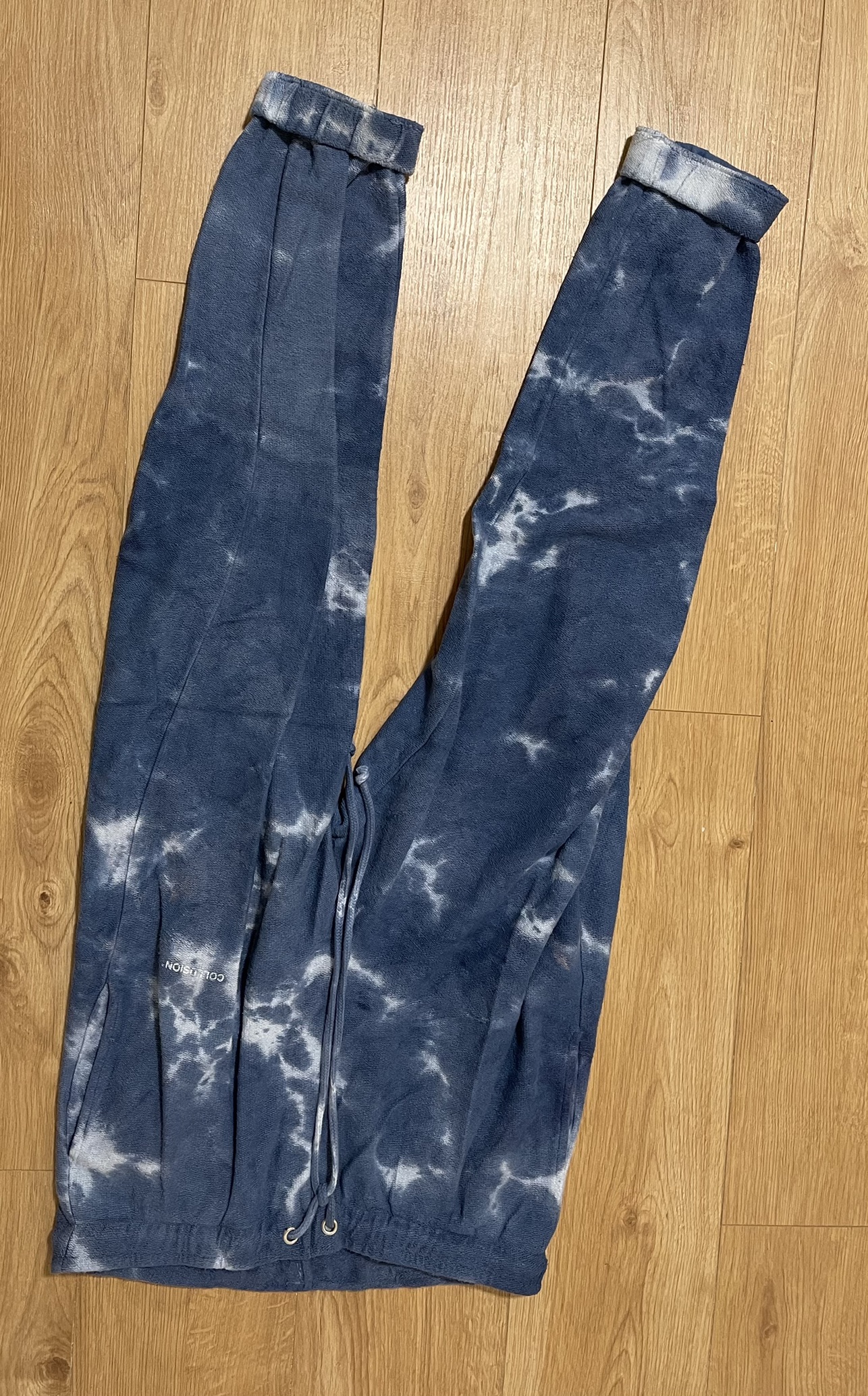 מכנס טרנינג כחול עם טיי-דיי לבן. מידה XL. מהחברה collusion, לא נלבשו מעולם, נמכר עקב טעות במידה