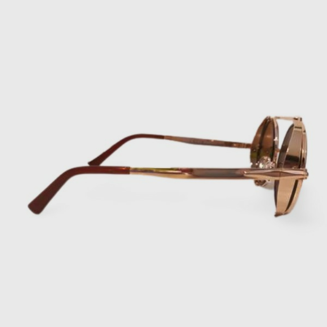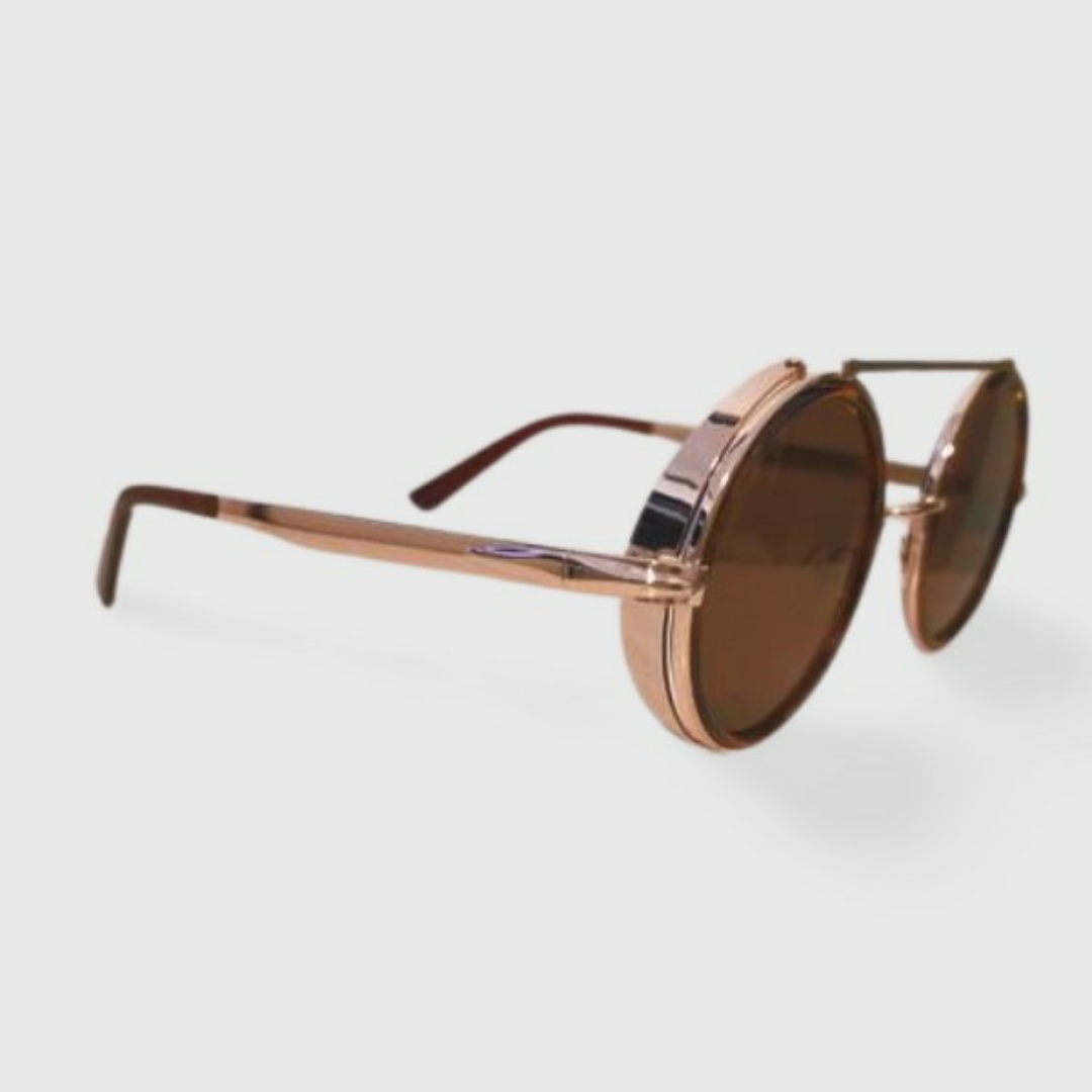 משקפי שמש עגולות , בסגנון פאנק סטריט, מסגרת מתכתי עם תוסף בצבע מנומר. עדשות חומות עם הגנה של 400uv .