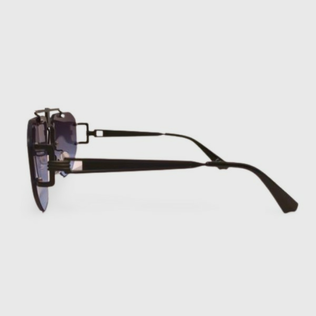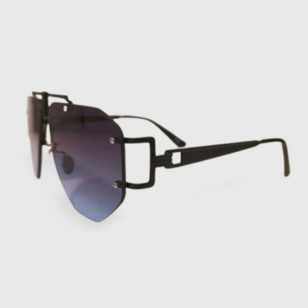 משקפי שמש יוניסקס , בצורת טייסים, עם מסגרת גדולה, שחורה ומעוצבת . ועדשות בשילוב של הצבעים שחור-כחול המספקות הגנה של 400uv.