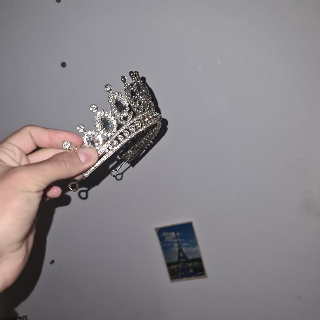 כתר עשוי מתכת צבע כסף עם יהלומים שיכול לתת ללוק חידוד עולמי. מתאים לימי הולדת ואירועים דומים!