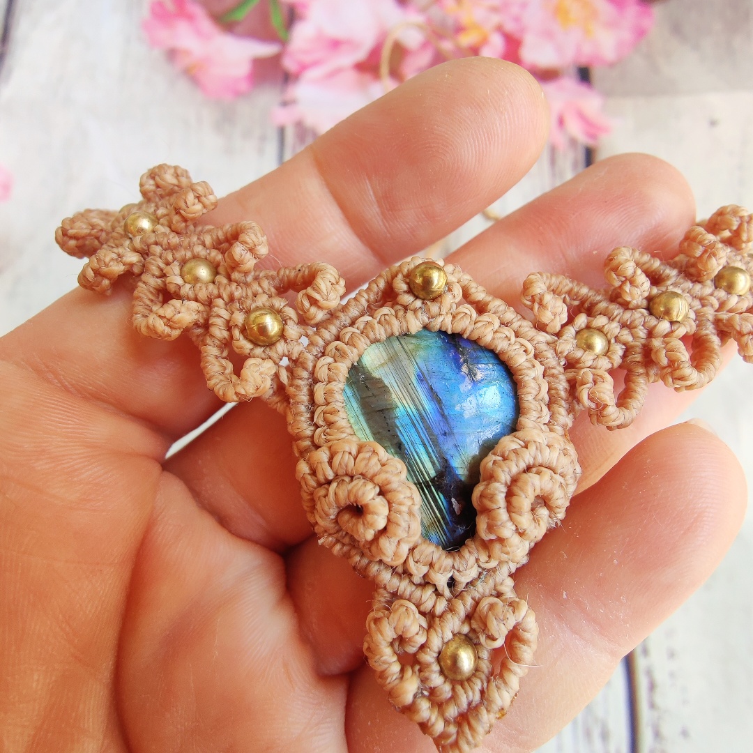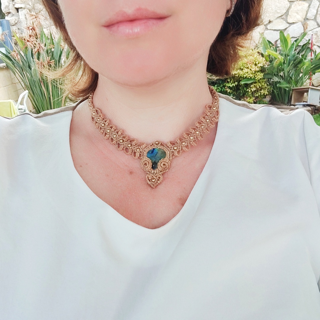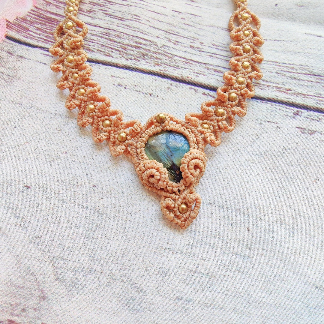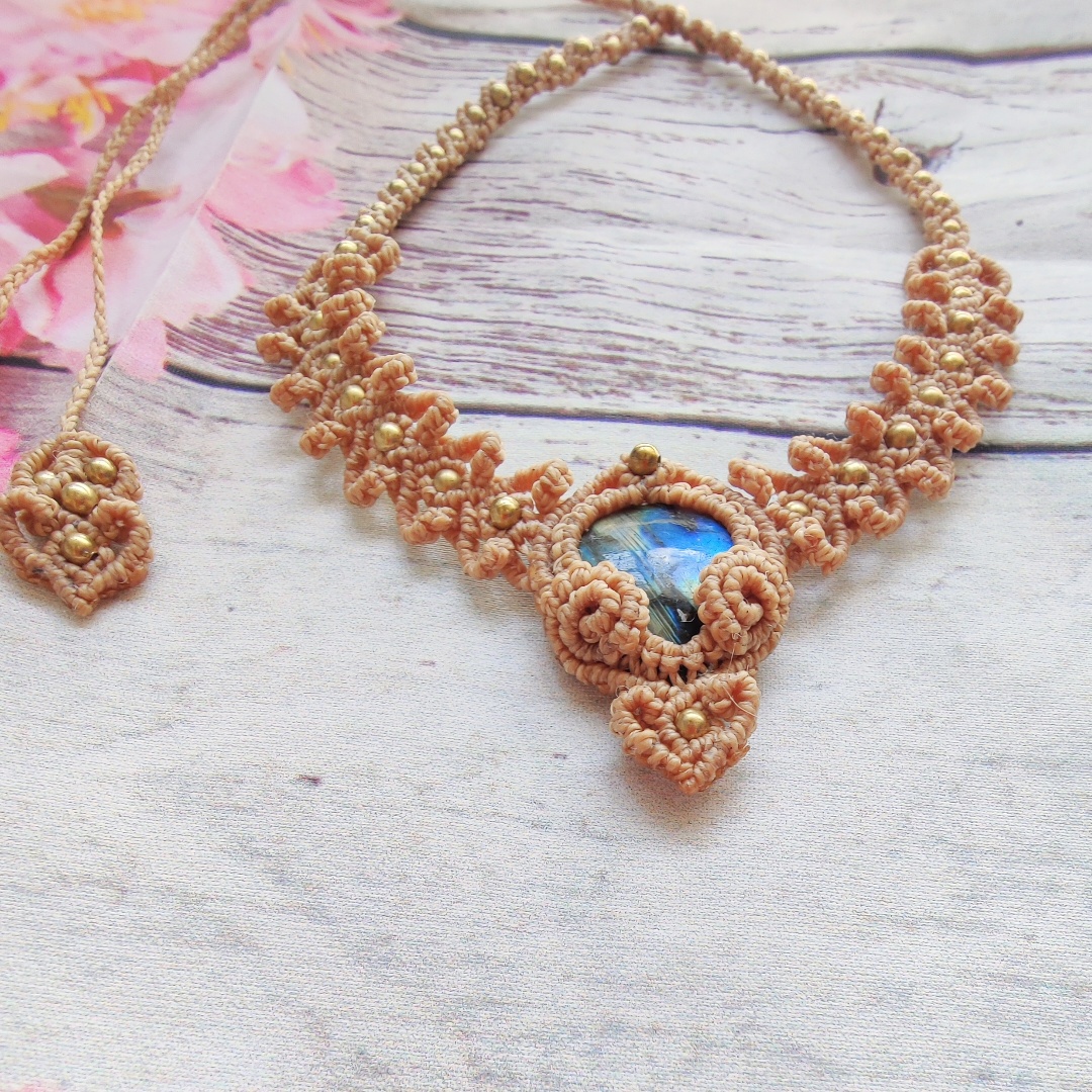 שרשרת יפה בסגנון בוהו עם גווני כחול, זהב ואפור ססגוניים של אבן לברדוריט. בנוסף עם חרוזי נחושת, המעניקים לקישוט עוד יותר ברק ואטרקטיביות. נוצר בטכניקת מקרמה עם תלתלים בצורת לבבות. ניתן לענוד את היצירה הייחודית הזו כשרשרת או כקולר, וסגירת השרוך מאפשרת לך להגדיל או להקטין את גודל היצירה.