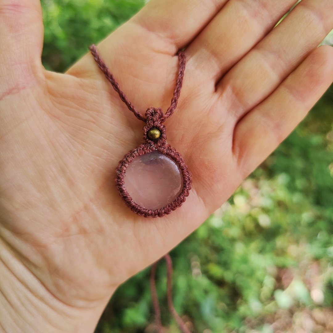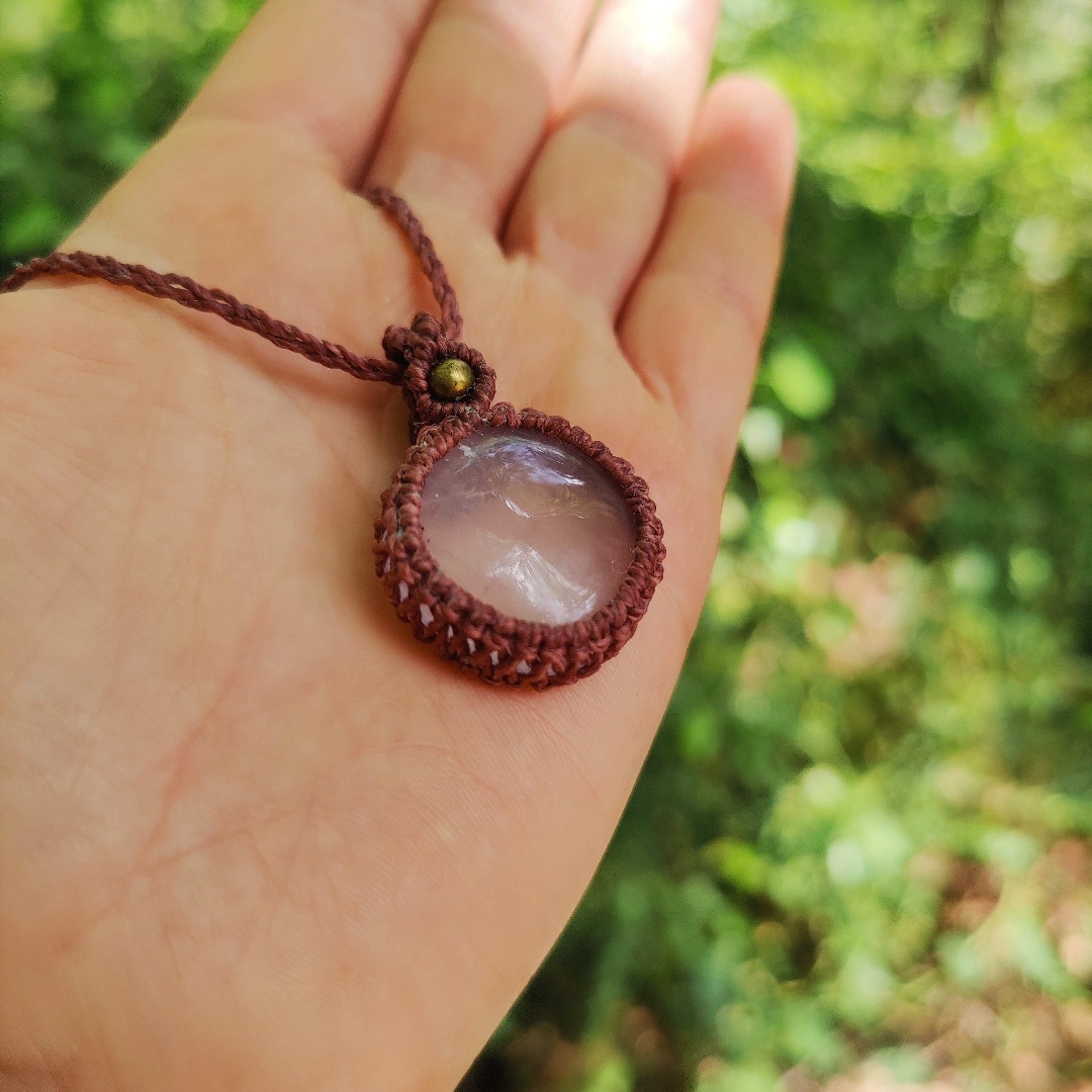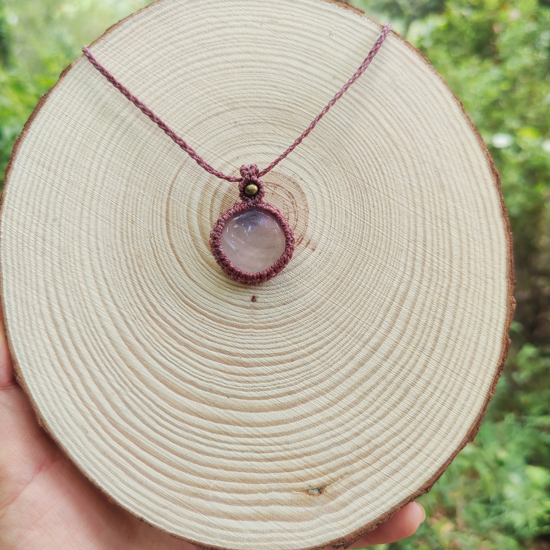 שרשרת מקרמה עם אבן קוורץ חלבי בשילוב חוטים צבע חום ורוד וחרוזים נחושת .האבן מסוגל להביא מזל טוב, להעניק לבעלים חוכמה ושלווה. וגם לעזור להחזיר את השקט למשפחה.