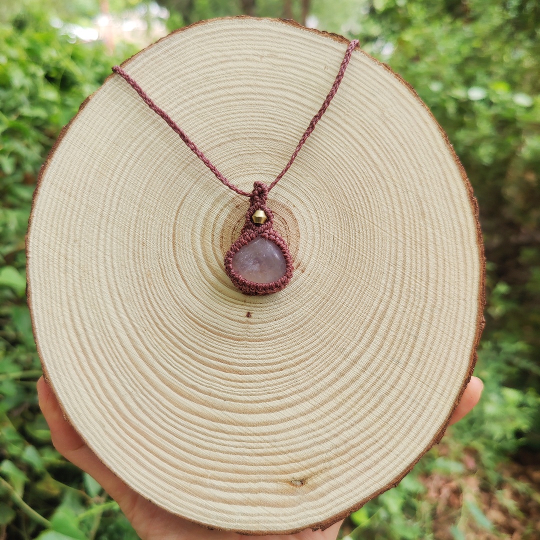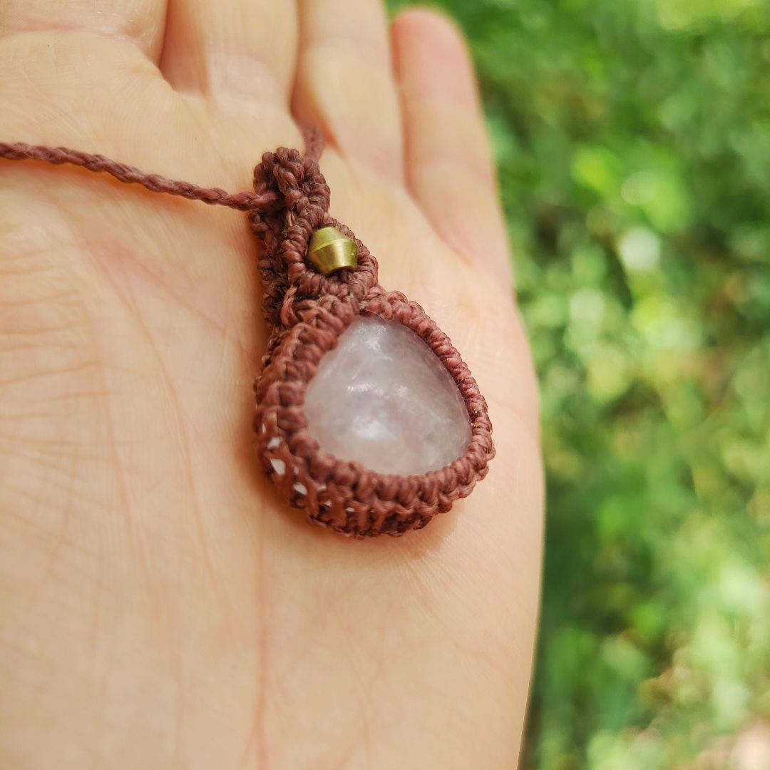 מקרמה שרשרת עם אבן קוורץ חלבי בשחלוב חוטי שעווה חומים וחרוזי נחושת .האבן מסוגל להביא מזל טוב, להעניק לבעלים חוכמה ושלווה. וגם לעזור להחזיר את השקט למשפחה.