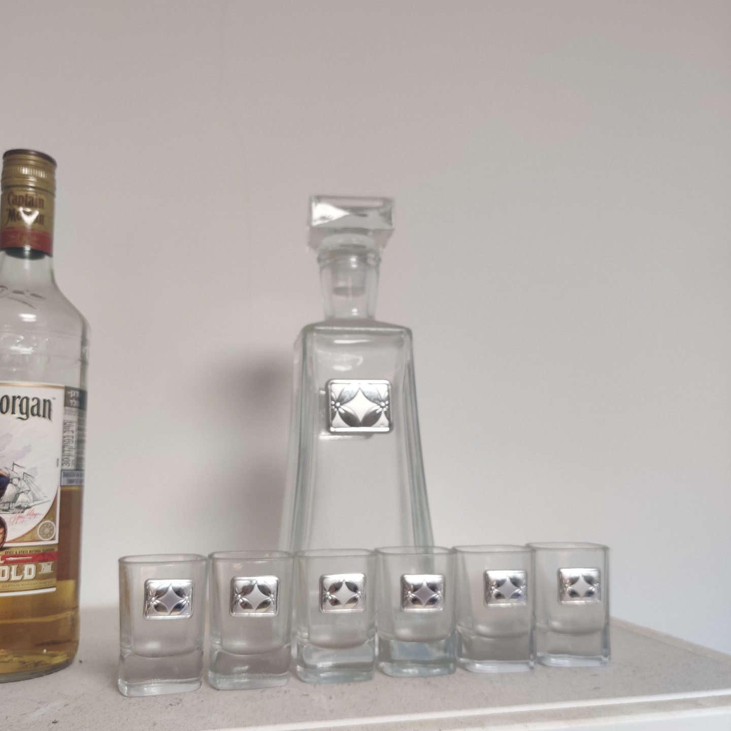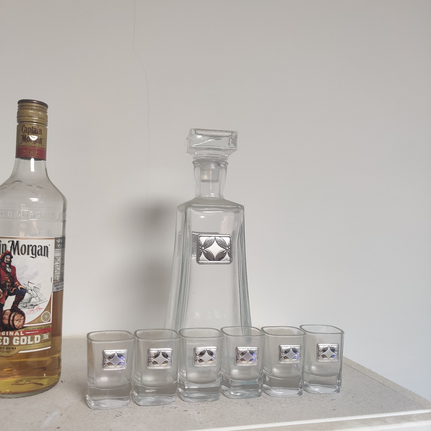 סט בקבוק ליקר וכוסות צ'ייסר של הצורפים (זכוכית וכסף)