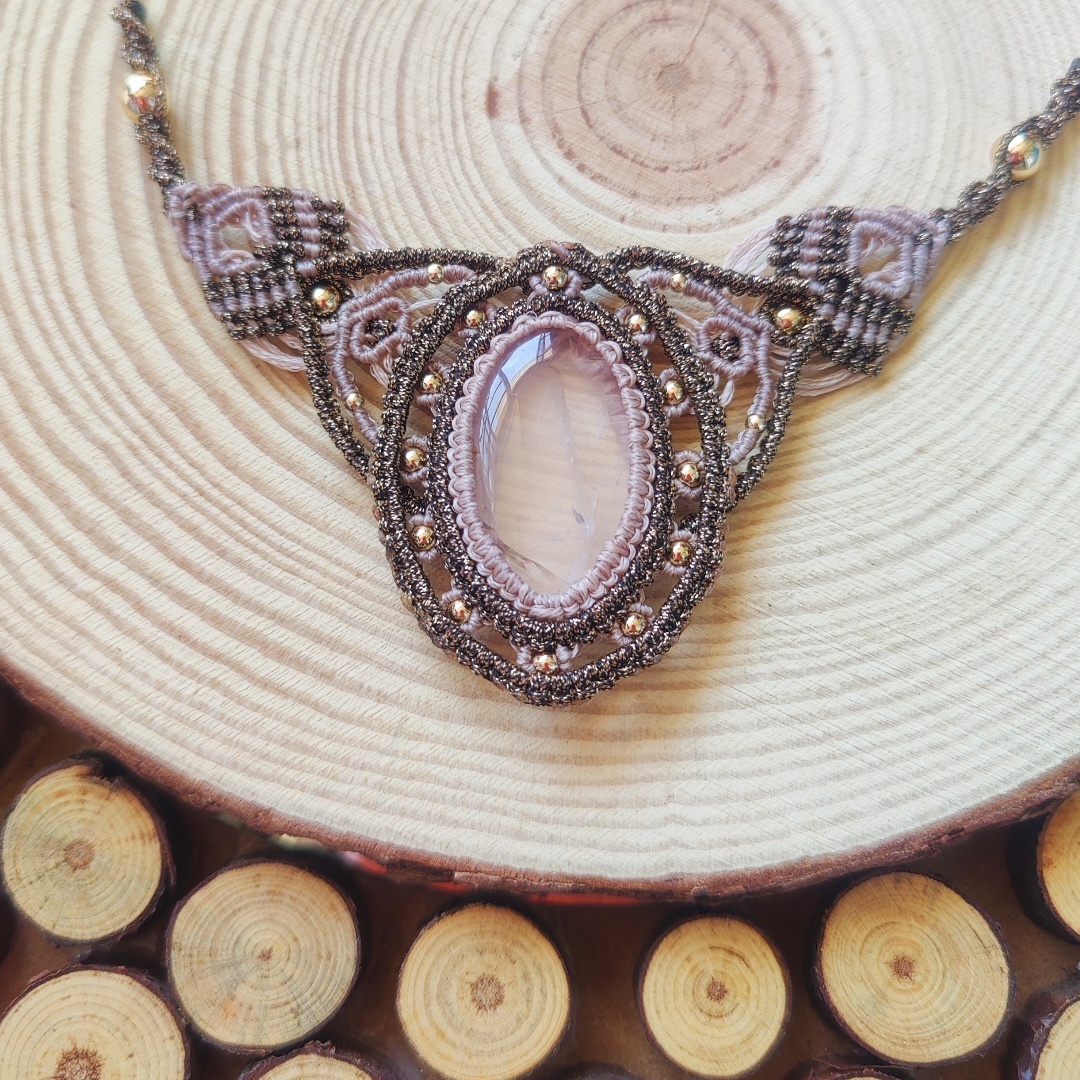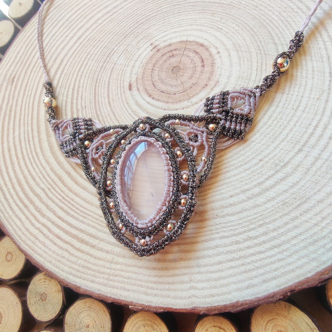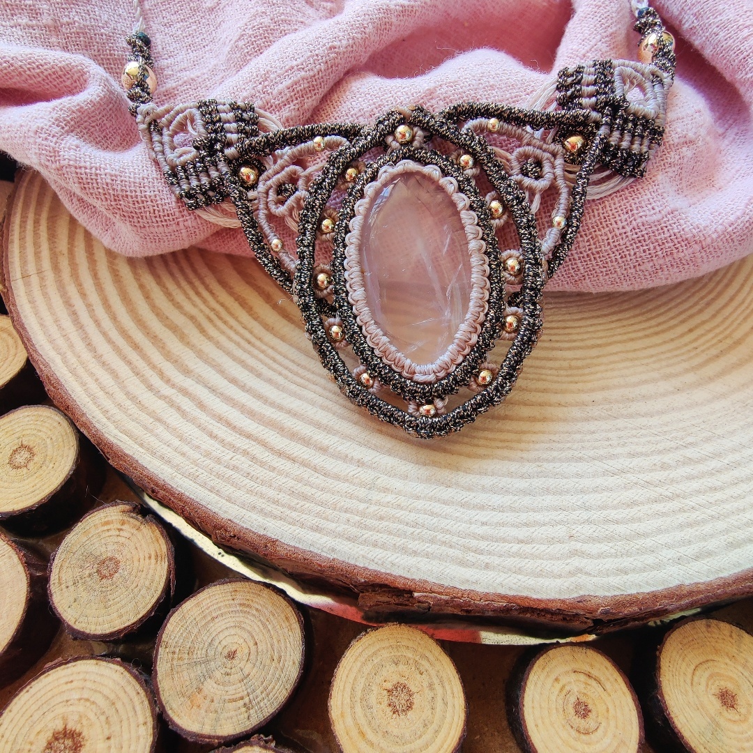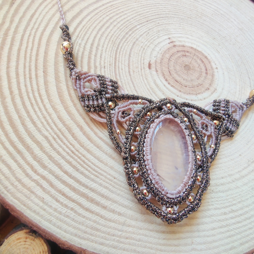 מקרמה שרשרת עם אבן מיוחדת קוורץ ורוד בשילוב של שני צבעי חוטים בז׳ וברונזה .