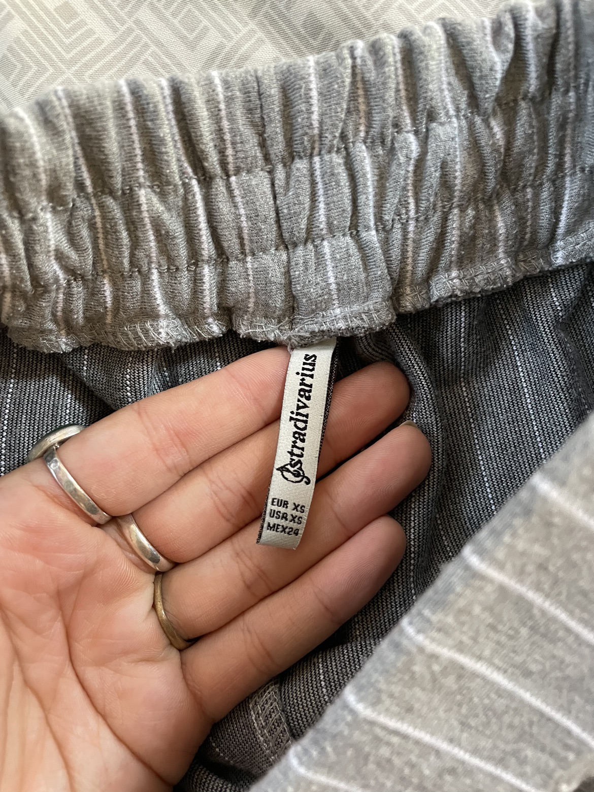 מכנס אפור עם פסים, צמוד למעלה, עם כיסים.