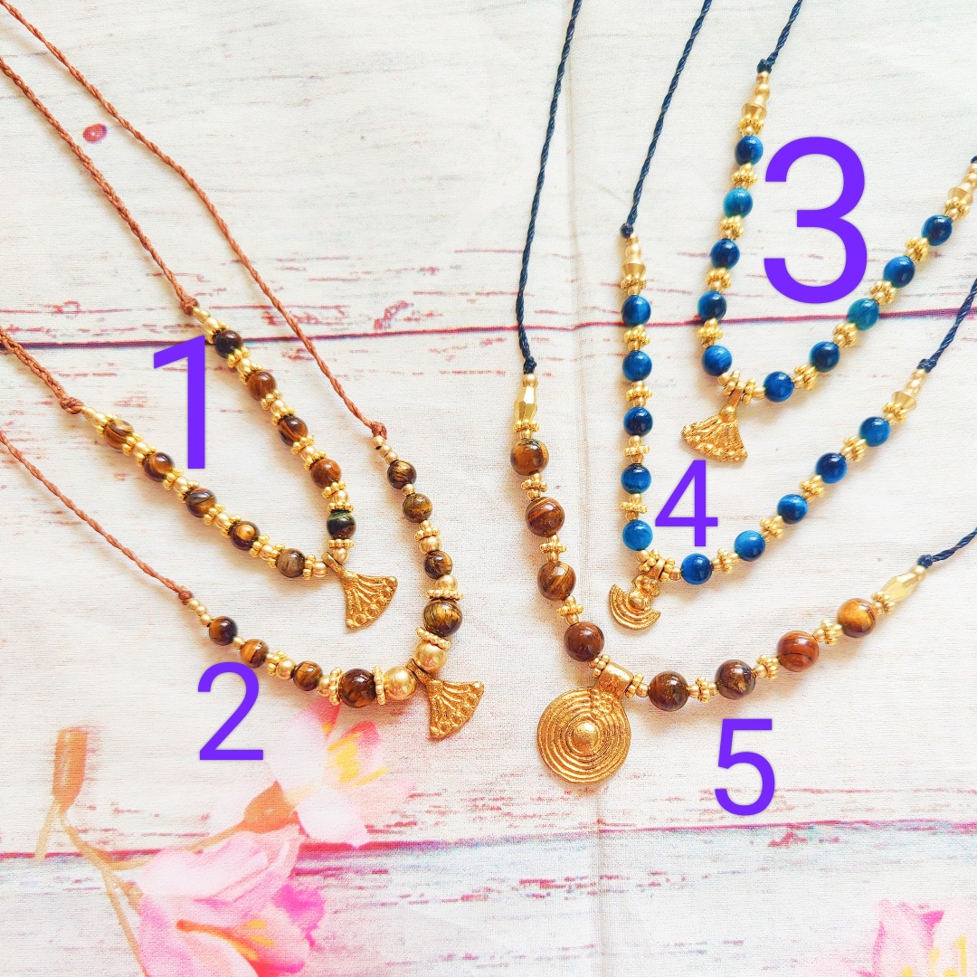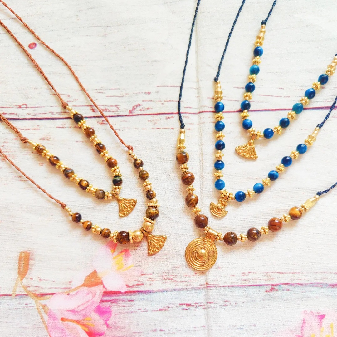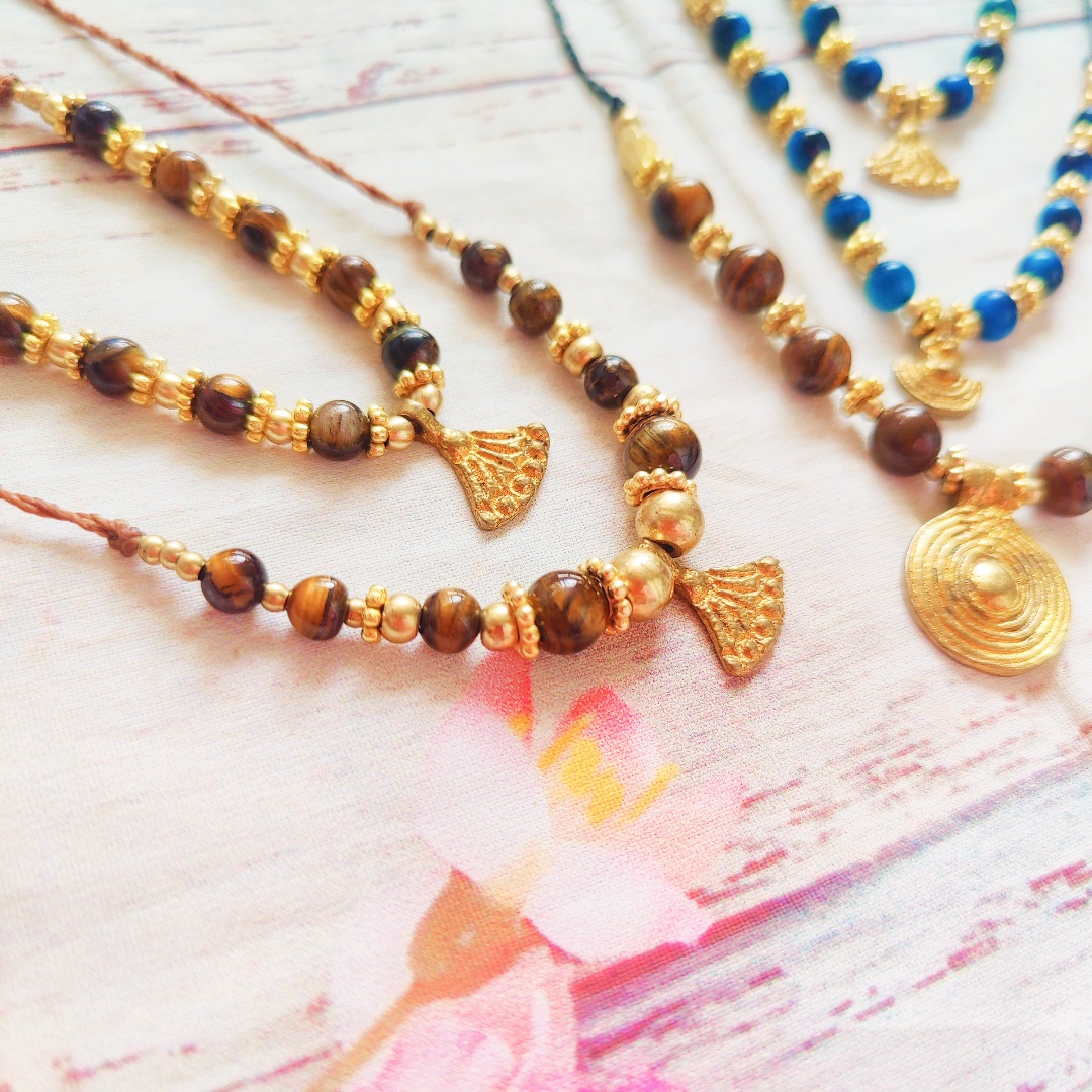 מקרמה שרשראות עם אבני עין נמר (טיגר איי) ותליונים.