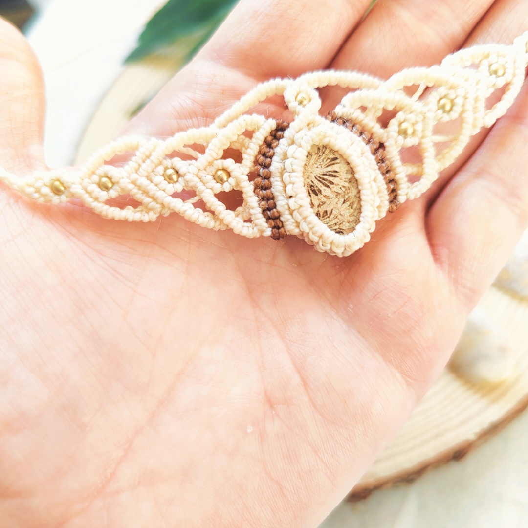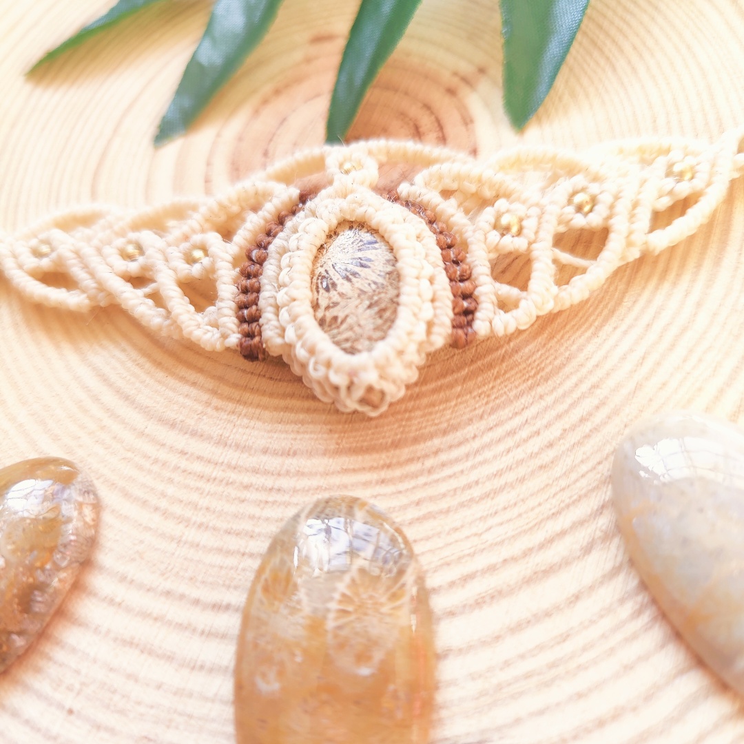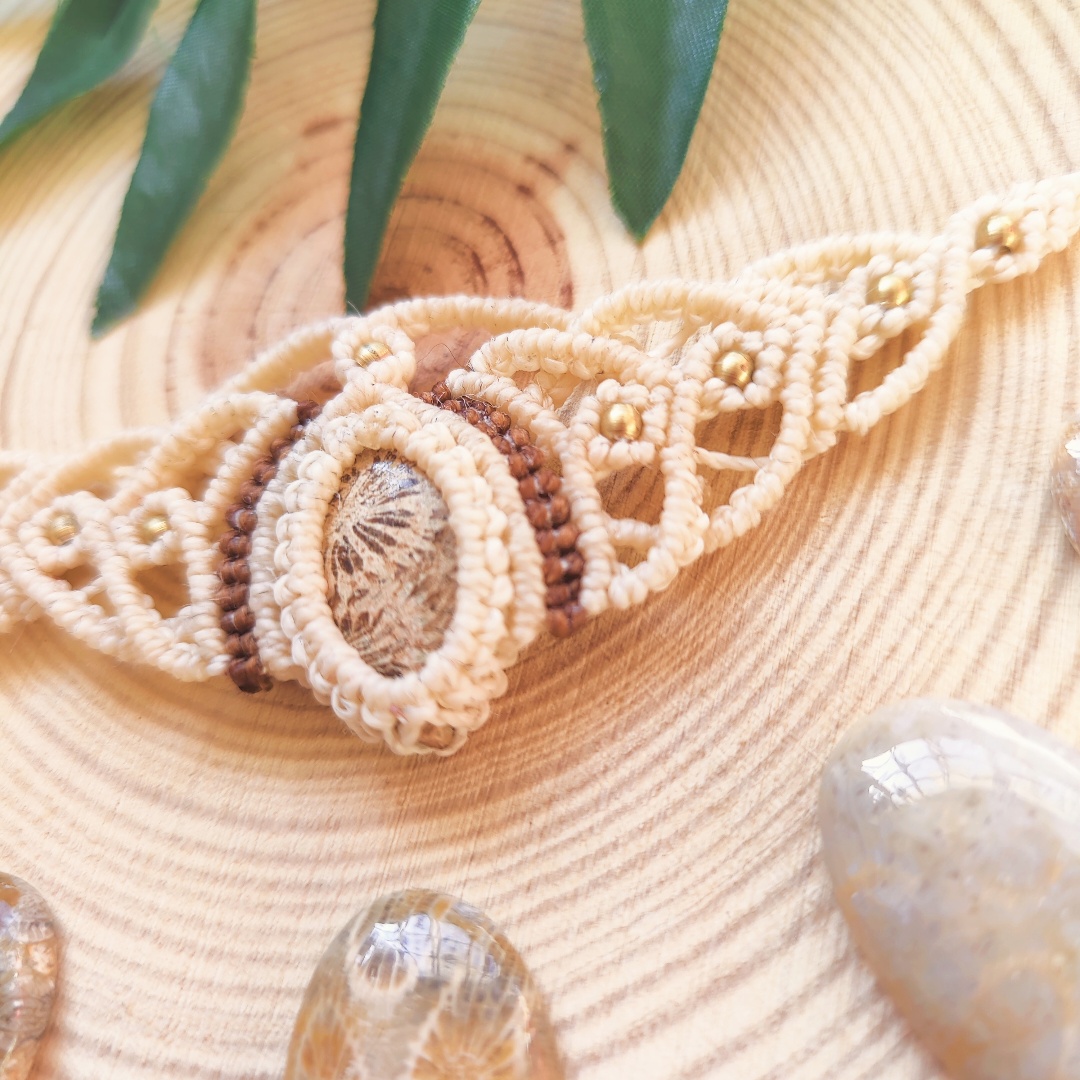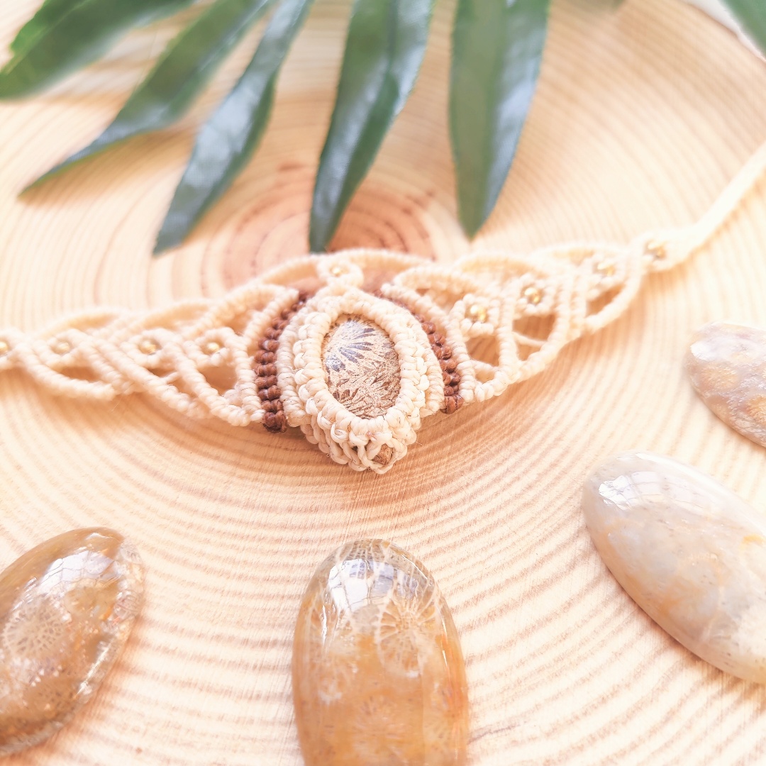 שרשרת חמודה ועדינה בגווני בז' עם אבן אלמוגים מאובנים. האבן טובה למשיכת מזל טוב, היא נחשבת לתרופה אוניברסלית להגנה מפני עין הרע ונזקים, ומקדמת חיים משגשגים יחד. לענוד תכשיטים עם האבן הזו הופכת נועזת יותר, בטוחה יותר בעצמה, וכאשר לובשים אותה במשך זמן רב, היא חושפת כישרונות, האינטלקט משתפר.