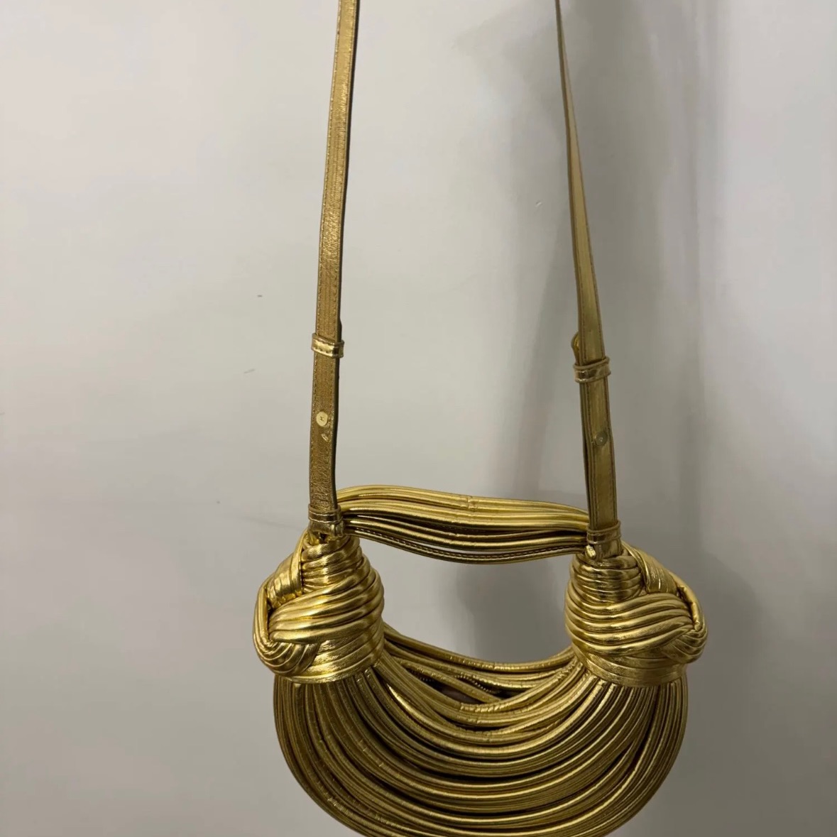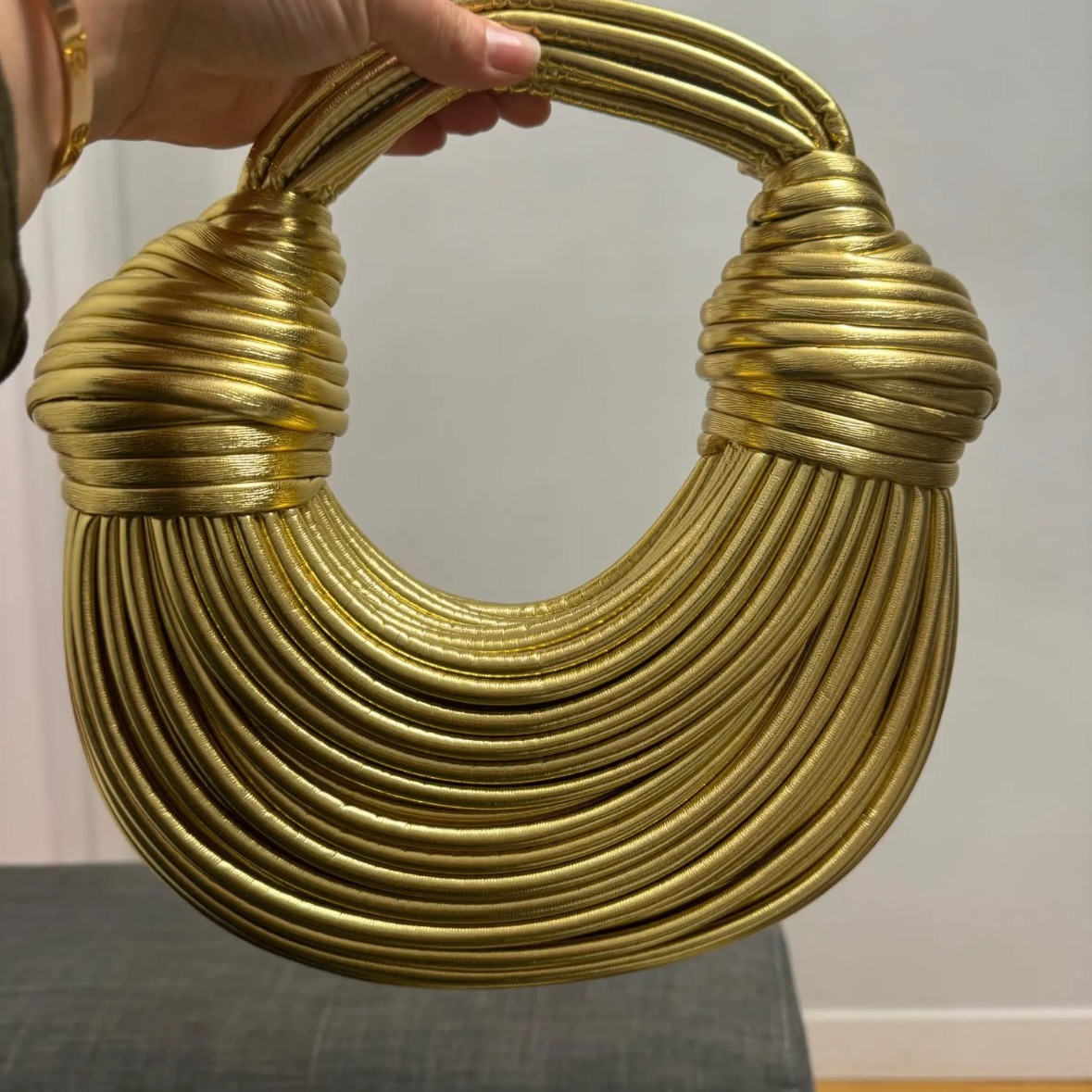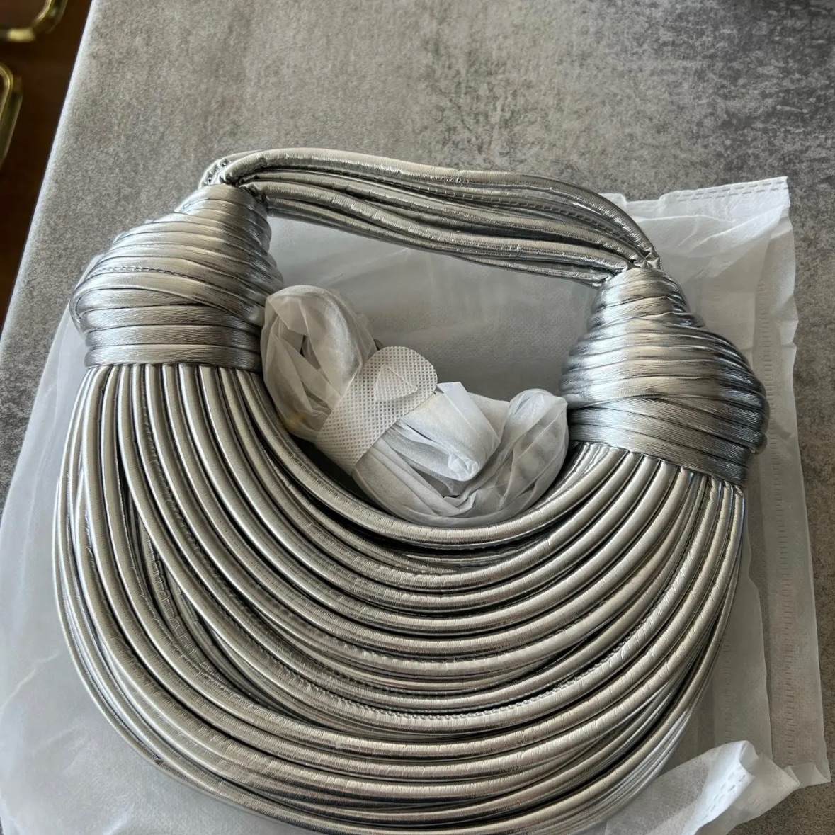 תיק יוקרה בסטייל ארוג צבע כסף וזהב, עם רצועה שמתחברת לתיק .