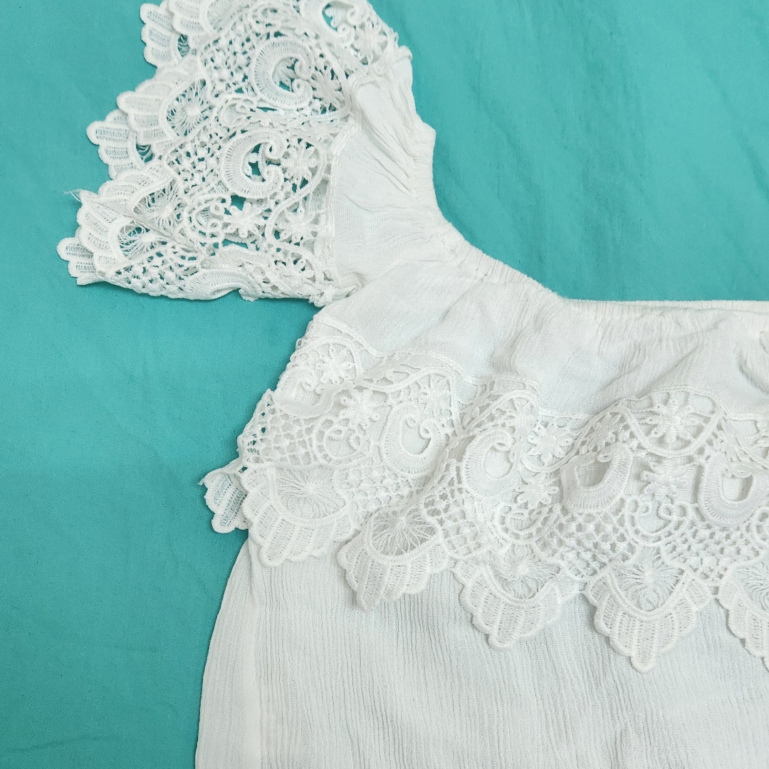 חולצה לבנה קצרה לכתפיים חשופות, מעוצבת עם תחרה ודיטלינג מיוחד