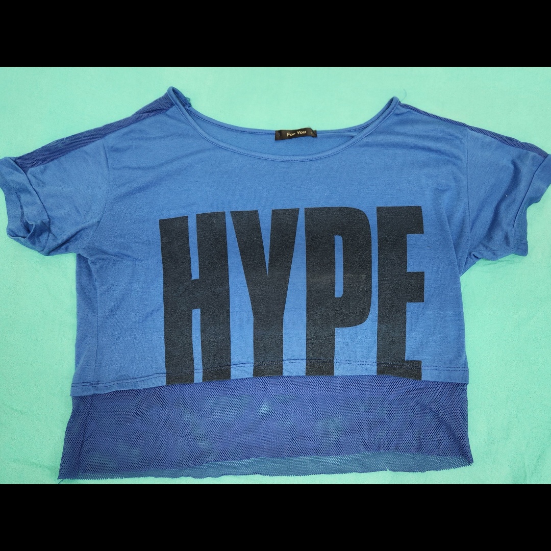חולצה כחולה אוברסייז עם כיתוב שחור ורשת כחולה באזור התחתון ואזור השרוול