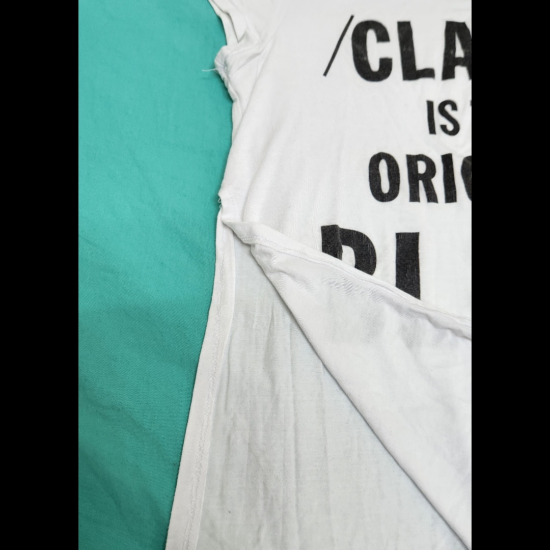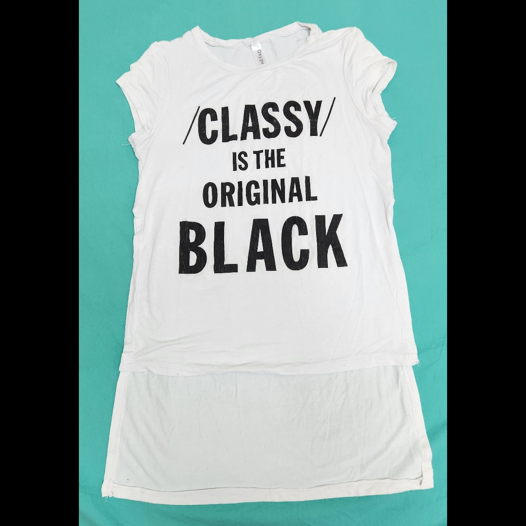 חולצה לבנה עם הדפס כיתוב שחור, פתח בצדי החולצה, ארוכה יותר מאחורנית.